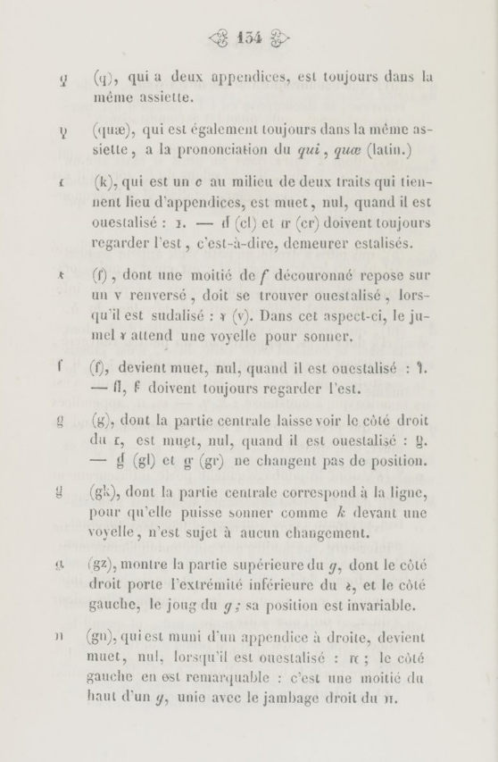 58L’évasion atteint son acmé avec les hétérodoxes que Blavier (2000) appelle les « fous littéraires », le critère d’appartenance à ce groupe étant de n’avoir pas (eu) de partisans. N’en citons qu’un exemple dans le domaine des graphèmes : celui de Bazin, Orbidaïe, ou Lettres et Mots éminemment propres à constituer une langue universelle, 1844, ouvrage contenant une « Explication des lettres orbidaïques » riche de 120 signes à valeur alphabétique, dont les formes ne sont pas sans rappeler l’alphasyllabaire guèze (fig. 4).